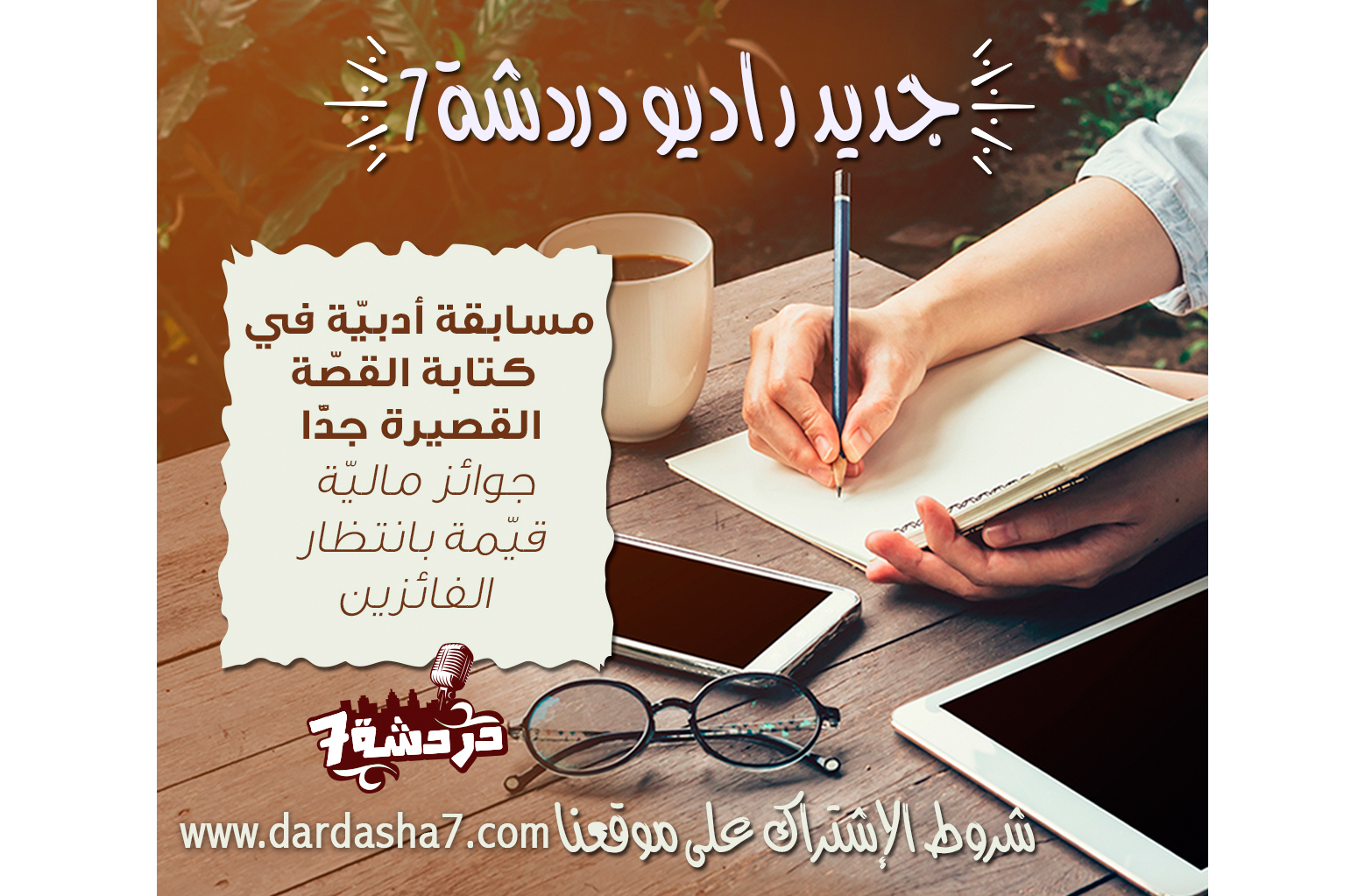 اسْتِمْرارًا مِنْهَا بِتَشْجِيعِ الْمَوَاهِبِ الْعَرَبِيَّةِ الشَّابَّةِ، يَسُرُّ أُسْرَةُ رَادْيُو دَرْدَشَة7 أَنْ تُنَظِّمَ مُسَابَقَةً أَدَبِيَّةً جَدِيدَةً فِي كِتَابَةِ القِصَّةِ القَصِيرَة جِدًّا.